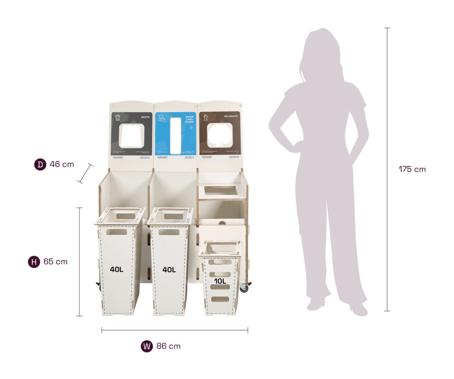 Lukittavilla pyörillä, selkeillä lajittelusymboleilla ja korkealaatuisilla vanerilaatikoilla varustettu säiliö yhdistää käytännöllisyyden ja pohjoismaisen inspiraation saaneen muotoilun. 17,5 kg:n painoinen Sortaider-tuote säästää noin 18,3 kg CO₂:ta, joten jokainen säiliö on merkityksellinen askel kohti kestävää kehitystä.