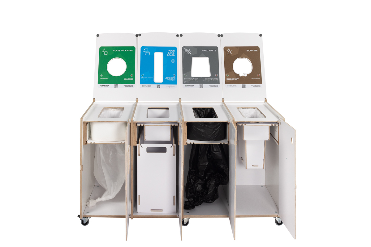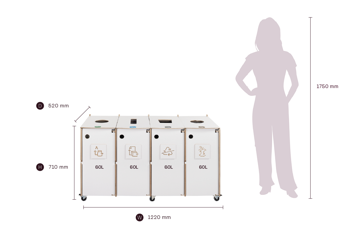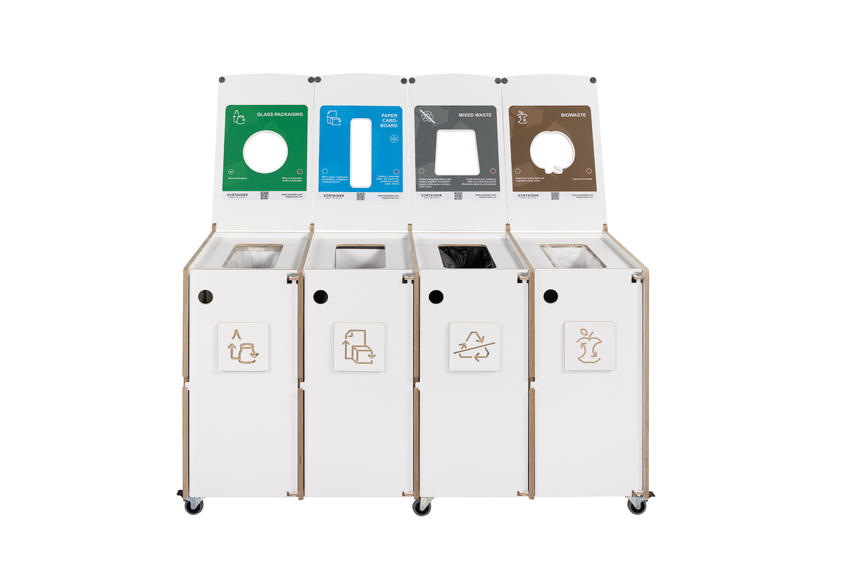 Selkeät visuaaliset ohjeet varmistavat oikean lajittelun, kun taas edestä avautuvat ovet ja lukittavat pyörät tekevät päivittäisestä käsittelystä ja huollosta helppoa ja tehokasta. Ihanteellinen ratkaisu toimistoihin, kouluihin ja julkisiin sisätiloihin, joissa arvostetaan muotoilua, mukautuvuutta ja kestävyyttä.