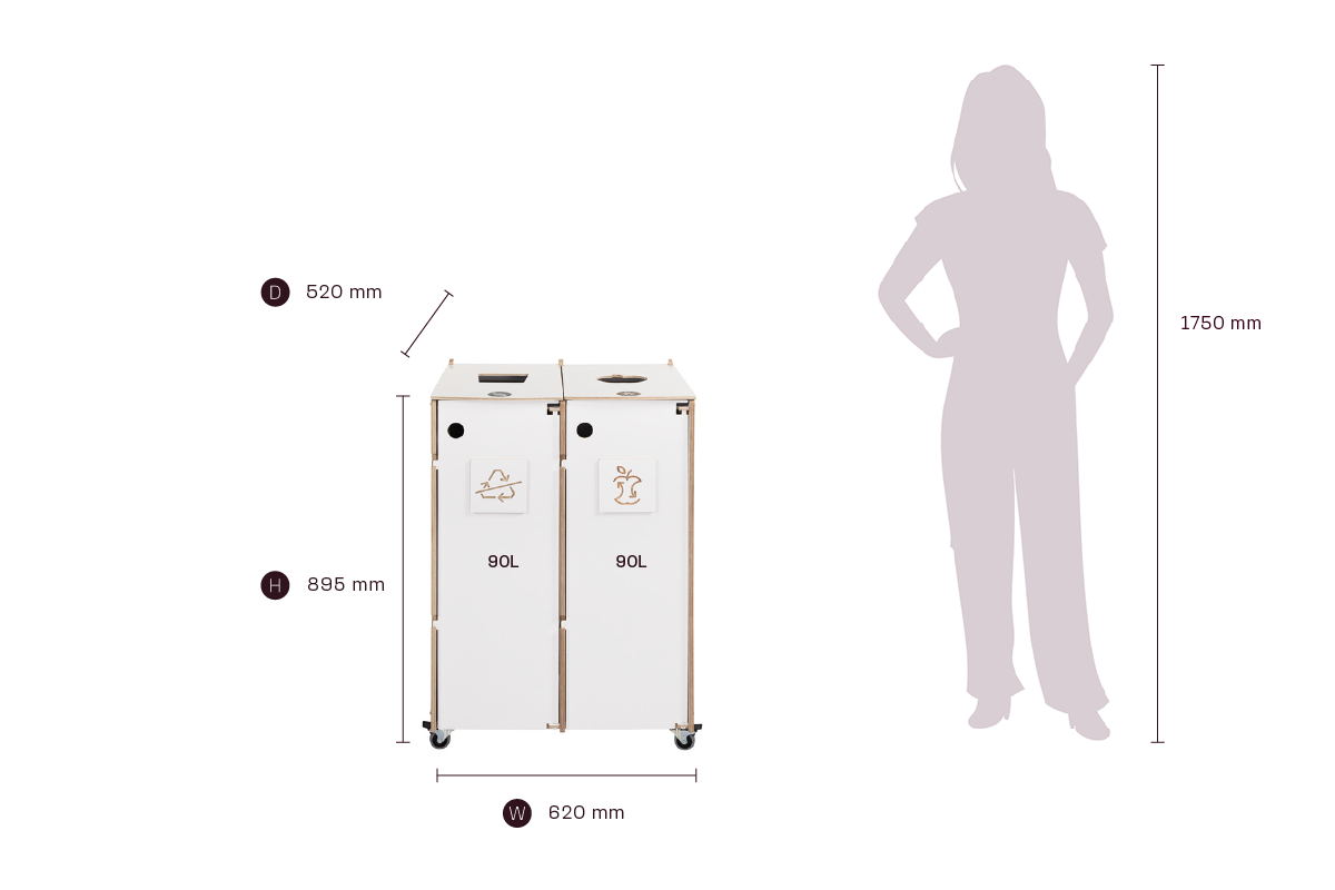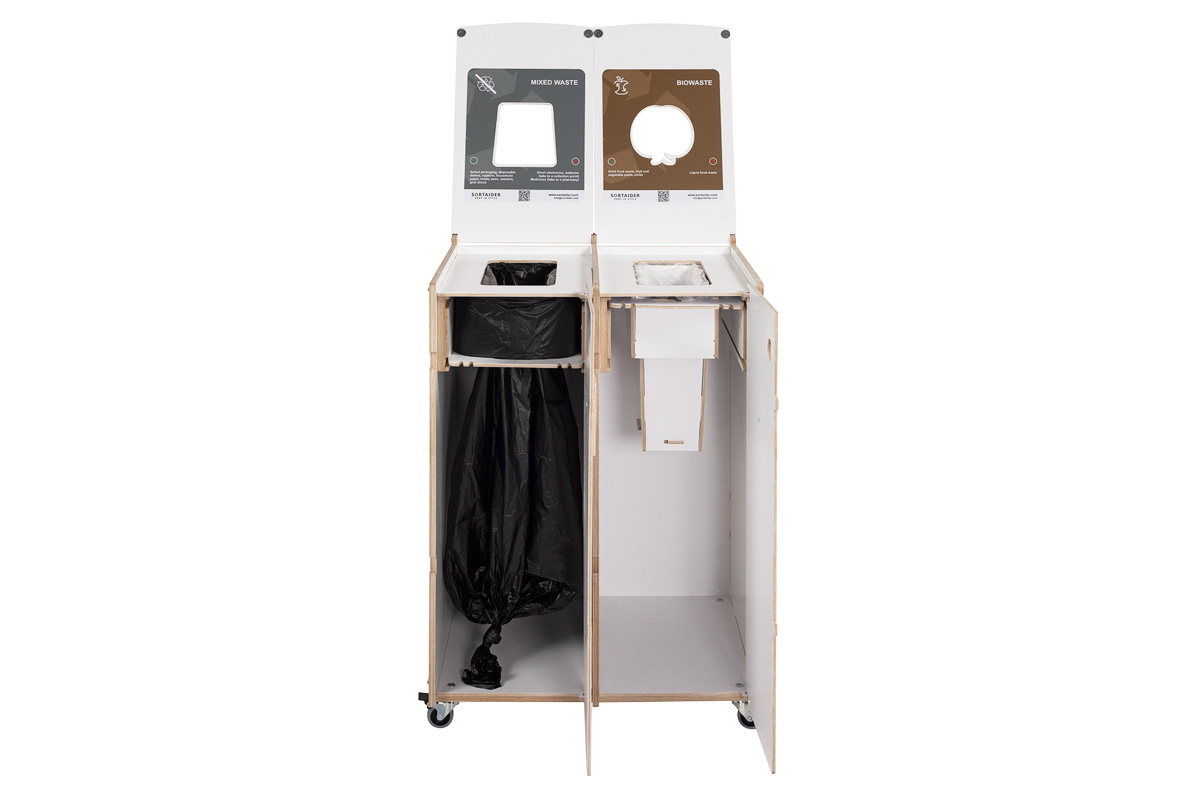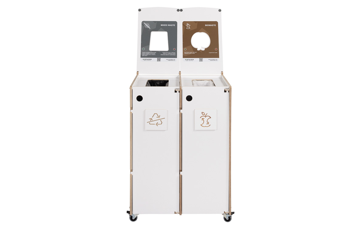 Selkeät visuaaliset ohjeet varmistavat oikean lajittelun, kun taas edestä avautuvat ovet ja lukittavat pyörät tekevät päivittäisestä käsittelystä ja huollosta helppoa ja tehokasta. Ihanteellinen ratkaisu toimistoihin, kouluihin ja julkisiin sisätiloihin, joissa arvostetaan muotoilua, mukautuvuutta ja kestävyyttä.