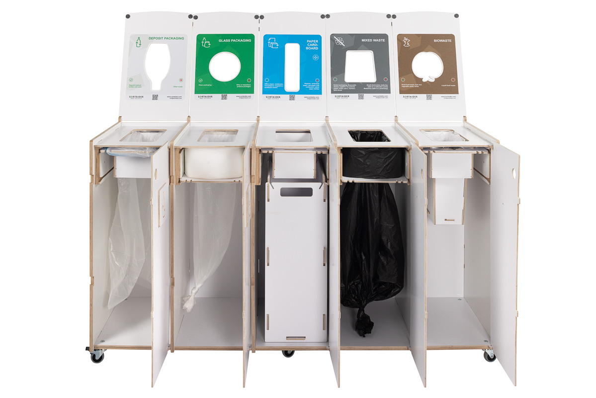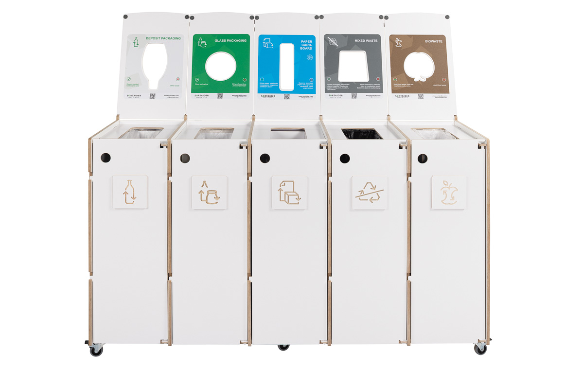 Built for durability and functionality, Sorta features high-quality plywood compartments, lockable swivel wheels, and multilingual, color-coded sorting symbols to support correct disposal. Its robust construction is suitable for high-traffic areas, while the tool-free bag replacement system ensures fast maintenance and hygienic use.