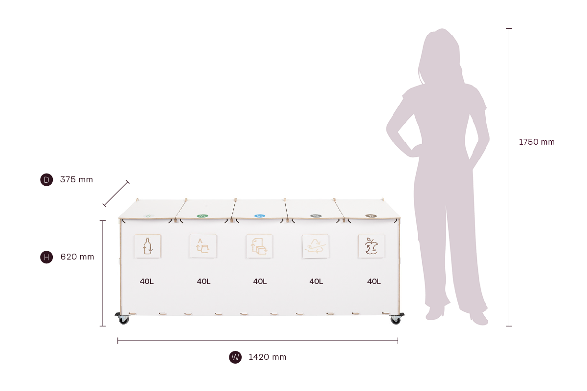 Kompaktin kokonsa ja tehokkaan kapasiteettinsa ansiosta Sorta yhdistää kestävät vanerimateriaalit ja toimivan muotoilun, mikä tekee siitä luotettavan ratkaisun järjestelmälliseen ja vastuulliseen jätehuoltoon ammattimaisissa ympäristöissä.