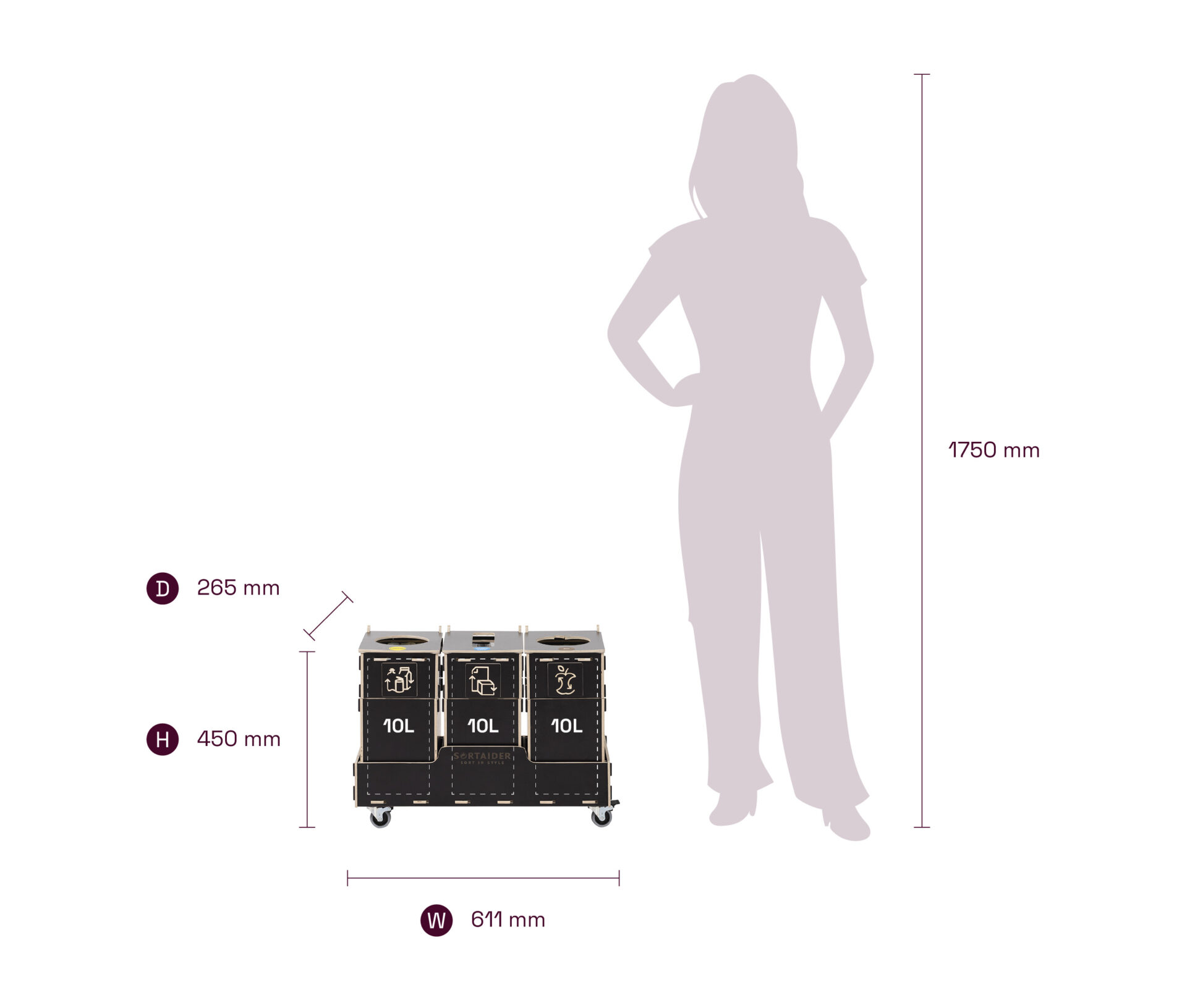 Lukittavilla pyörillä, selkeillä lajittelusymboleilla ja korkealaatuisilla vanerilaatikoilla varustettu laite yhdistää käytännöllisyyden ja pohjoismaisen inspiraation saaneen muotoilun. 10,4 kg:n painoinen Sortaider-tuote säästää noin 11,2 kg CO₂:ta, joten jokainen lajittelulaatikko on merkityksellinen askel kohti kestävää kehitystä.