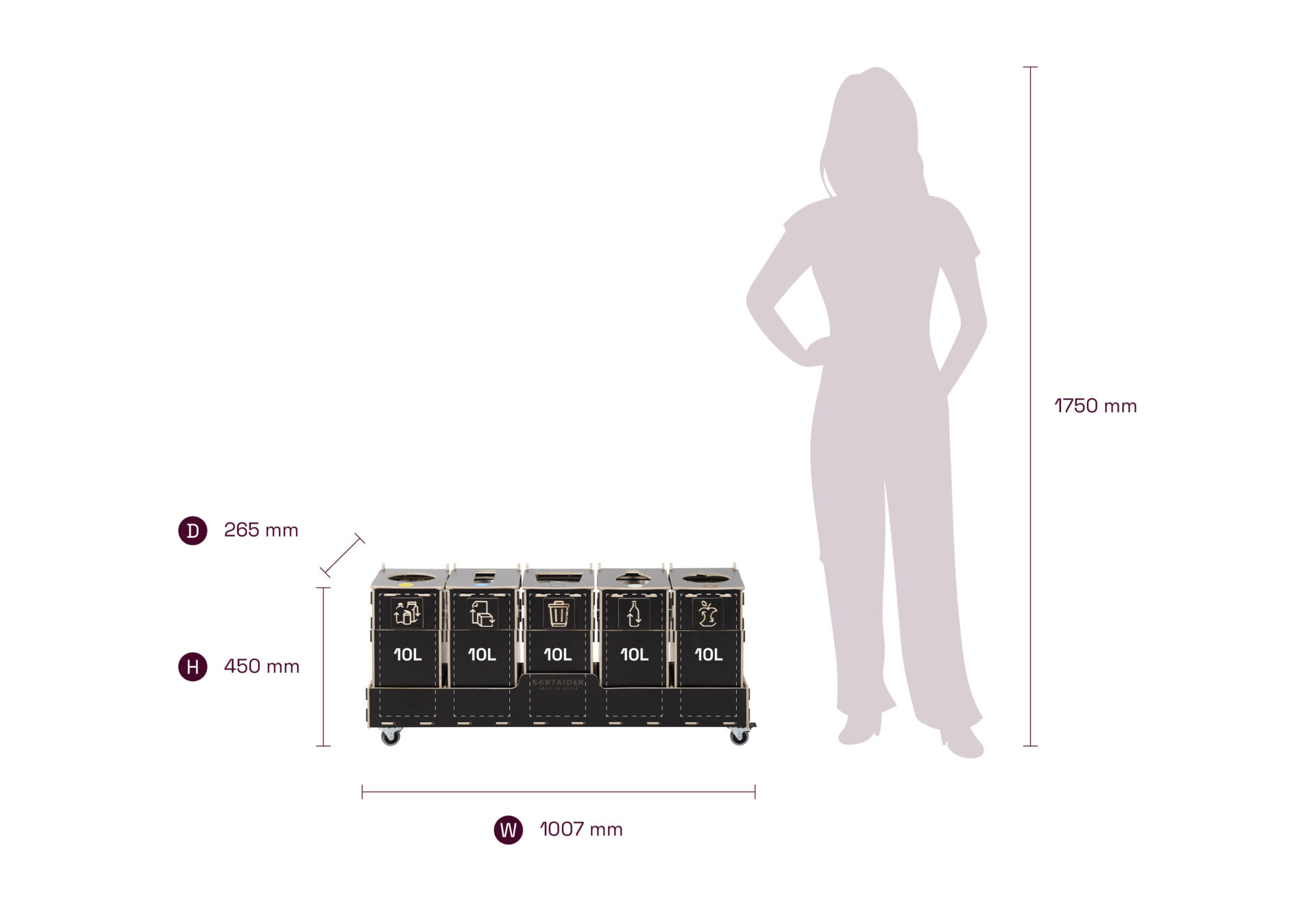Recycling Bin Sorter on tyylikäs ja kompakti jätteiden lajitteluasema. Siinä on 1–5 erillistä lokeroa, jotka helpottavat ja tehostavat jätteiden lajittelua toimistoissa, kouluissa ja julkisissa tiloissa.