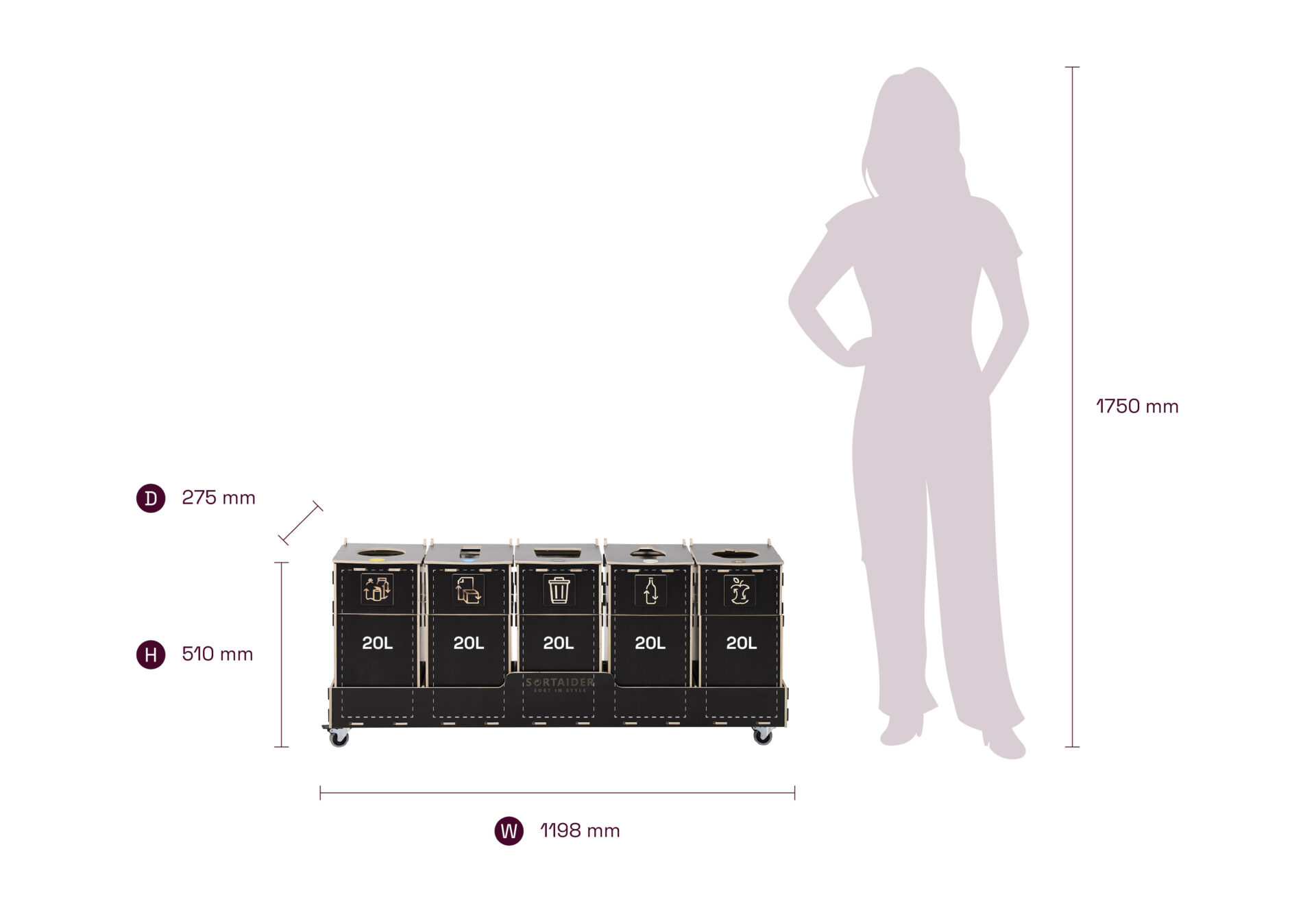 Lukittavilla pyörillä, selkeillä lajittelusymboleilla ja korkealaatuisilla vanerilaatikoilla varustettu lajittelulaatikko yhdistää käytännöllisyyden ja pohjoismaisen inspiraation. 23,6 kg painava Sortaider-tuote säästää noin 24,4 kg CO₂, joten jokainen laatikko on merkityksellinen askel kohti kestävää kehitystä.