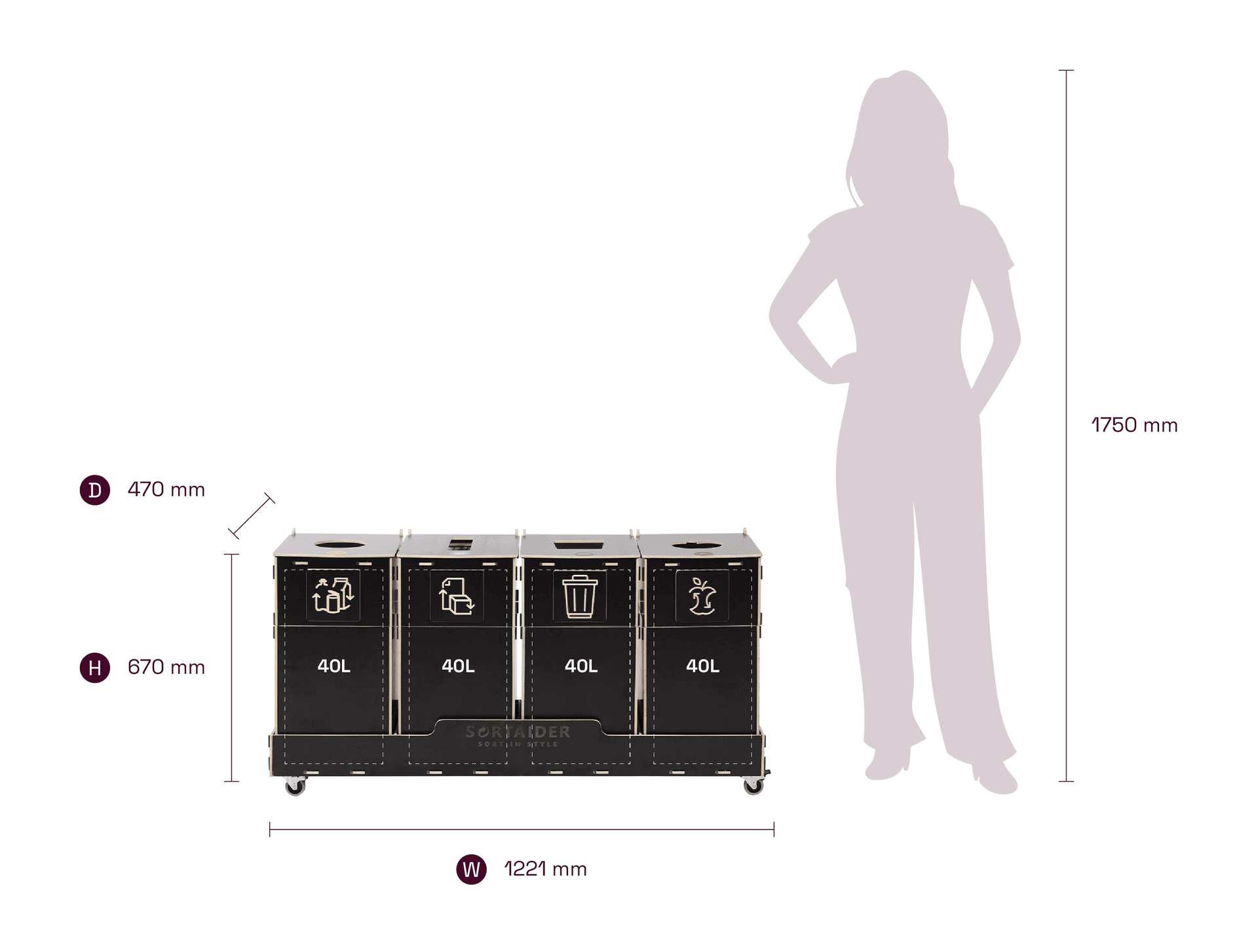 Lukittavilla pyörillä, selkeillä lajittelusymboleilla ja korkealaatuisilla vanerilaatikoilla varustettu laite yhdistää käytännöllisyyden ja pohjoismaisen inspiraation saaneen muotoilun. 31 kg:n painoinen Sortaider-tuote säästää noin 31,8 kg CO₂:ta, joten jokainen lajittelulaatikko on merkityksellinen askel kohti kestävää kehitystä.