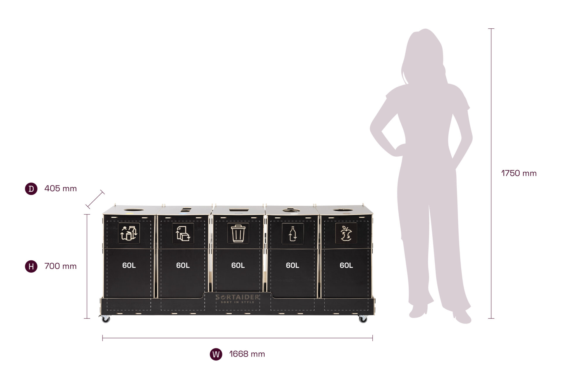 Lukittavilla pyörillä, selkeillä lajittelusymboleilla ja korkealaatuisilla vanerilaatikoilla varustettu laite yhdistää käytännöllisyyden ja pohjoismaisen inspiraation saaneen muotoilun. 43,8 kg:n painoinen Sortaider-tuote säästää noin 44,6 kg CO₂:ta, joten jokainen lajittelulaatikko on merkityksellinen askel kohti kestävää kehitystä.