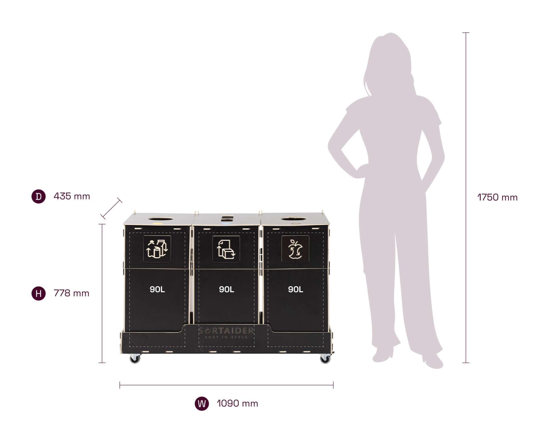 Lukittavilla pyörillä, selkeillä lajittelusymboleilla ja korkealaatuisilla vanerilaatikoilla varustettu laite yhdistää käytännöllisyyden ja pohjoismaisen inspiraation saaneen muotoilun. 28,3 kg:n painoinen Sortaider-tuote säästää noin 29,1 kg CO₂:ta, joten jokainen roskalaatikko on merkityksellinen askel kohti kestävää kehitystä.