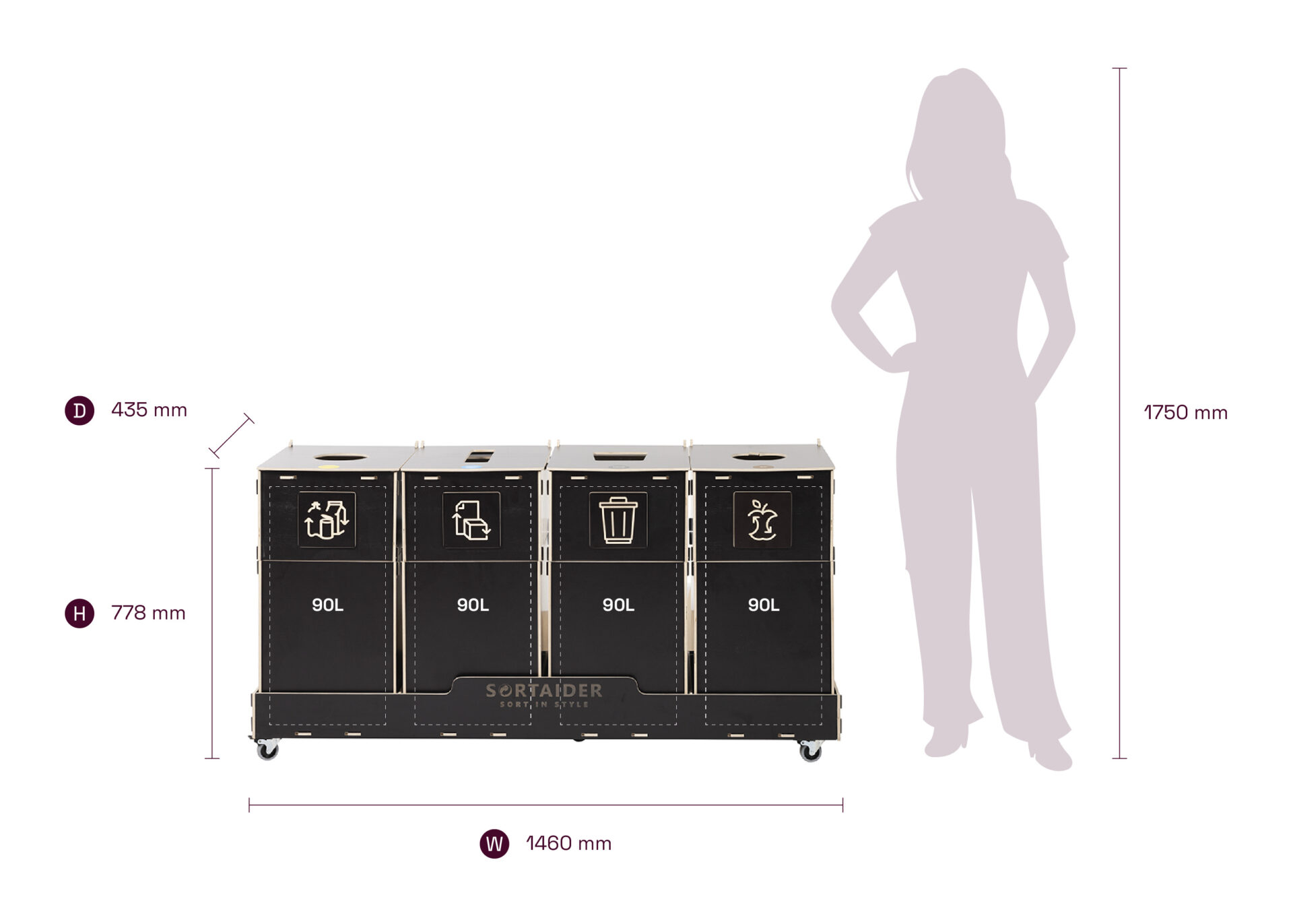 Lukittavilla pyörillä, selkeillä lajittelusymboleilla ja korkealaatuisilla vanerilaatikoilla varustettu laite yhdistää käytännöllisyyden ja pohjoismaisen inspiraation saaneen muotoilun. 37,8 kg painava Sortaider-tuote säästää noin 38,6 kg CO₂:ta, joten jokainen roskalaatikko on merkityksellinen askel kohti kestävää kehitystä.