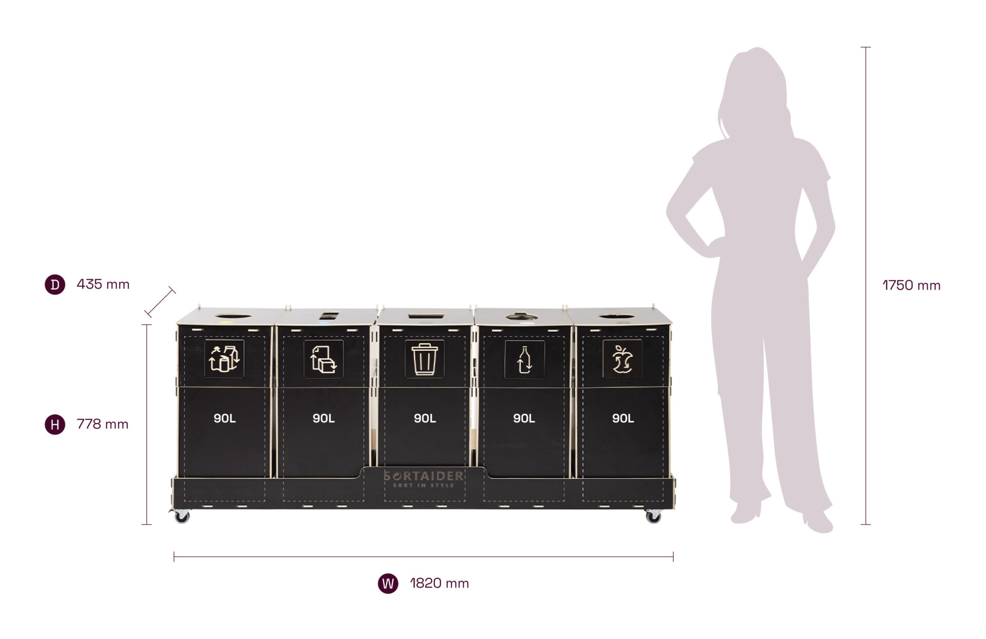 Lukittavilla pyörillä, selkeillä lajittelusymboleilla ja korkealaatuisilla vanerilaatikoilla varustettu laite yhdistää käytännöllisyyden ja pohjoismaisen inspiraation saaneen muotoilun. 47,8 kg painava Sortaider-tuote säästää noin 48,6 kg CO₂:ta, joten jokainen roskalaatikko on merkityksellinen askel kohti kestävää kehitystä.