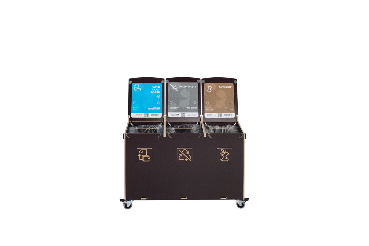 Built for durability and functionality, Sorta features high-quality plywood compartments, lockable swivel wheels, and multilingual, color-coded sorting symbols to support correct disposal. Its robust construction is suitable for high-traffic areas, while the tool-free bag replacement system ensures fast maintenance and hygienic use.