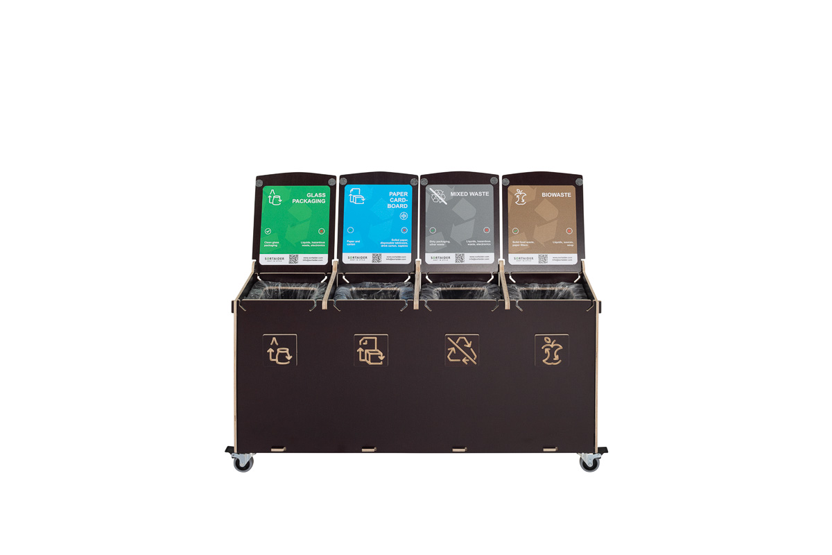 Built for durability and functionality, Sorta features high-quality plywood compartments, lockable swivel wheels, and multilingual, color-coded sorting symbols to support correct disposal. Its robust construction is suitable for high-traffic areas, while the tool-free bag replacement system ensures fast maintenance and hygienic use.