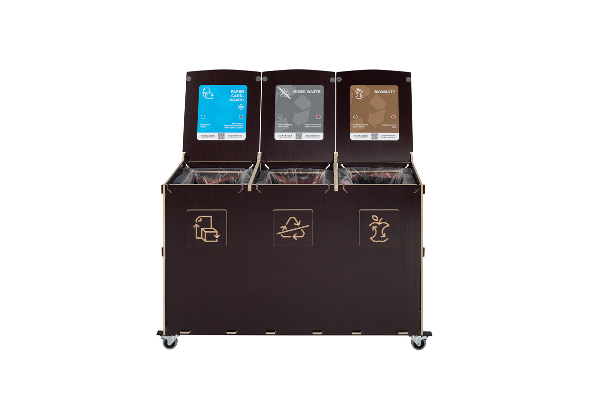 Built for durability and functionality, Sorta features high-quality plywood compartments, lockable swivel wheels, and multilingual, color-coded sorting symbols to support correct disposal. Its robust construction is suitable for high-traffic areas, while the tool-free bag replacement system ensures fast maintenance and hygienic use.