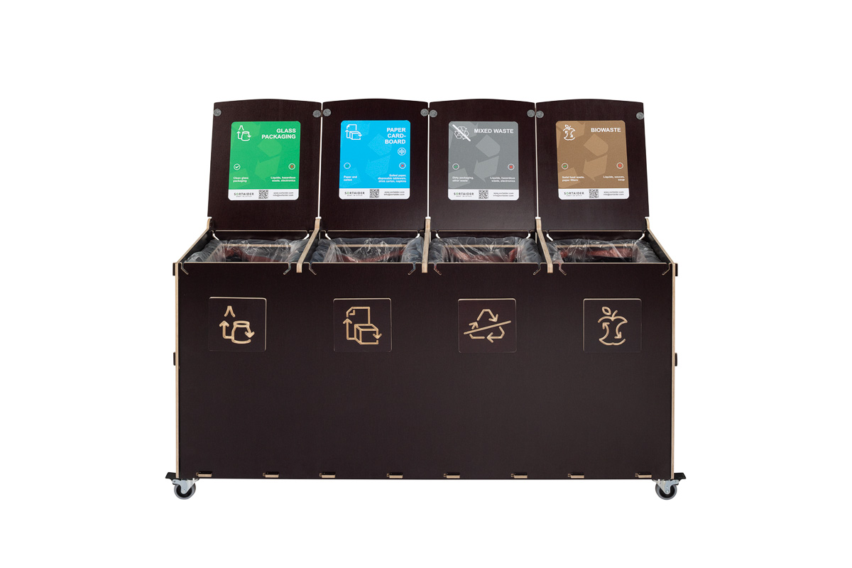 Built for durability and functionality, Sorta features high-quality plywood compartments, lockable swivel wheels, and multilingual, color-coded sorting symbols to support correct disposal. Its robust construction is suitable for high-traffic areas, while the tool-free bag replacement system ensures fast maintenance and hygienic use.