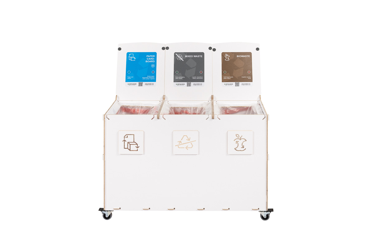 Built for durability and functionality, Sorta features high-quality plywood compartments, lockable swivel wheels, and multilingual, color-coded sorting symbols to support correct disposal. Its robust construction is suitable for high-traffic areas, while the tool-free bag replacement system ensures fast maintenance and hygienic use.