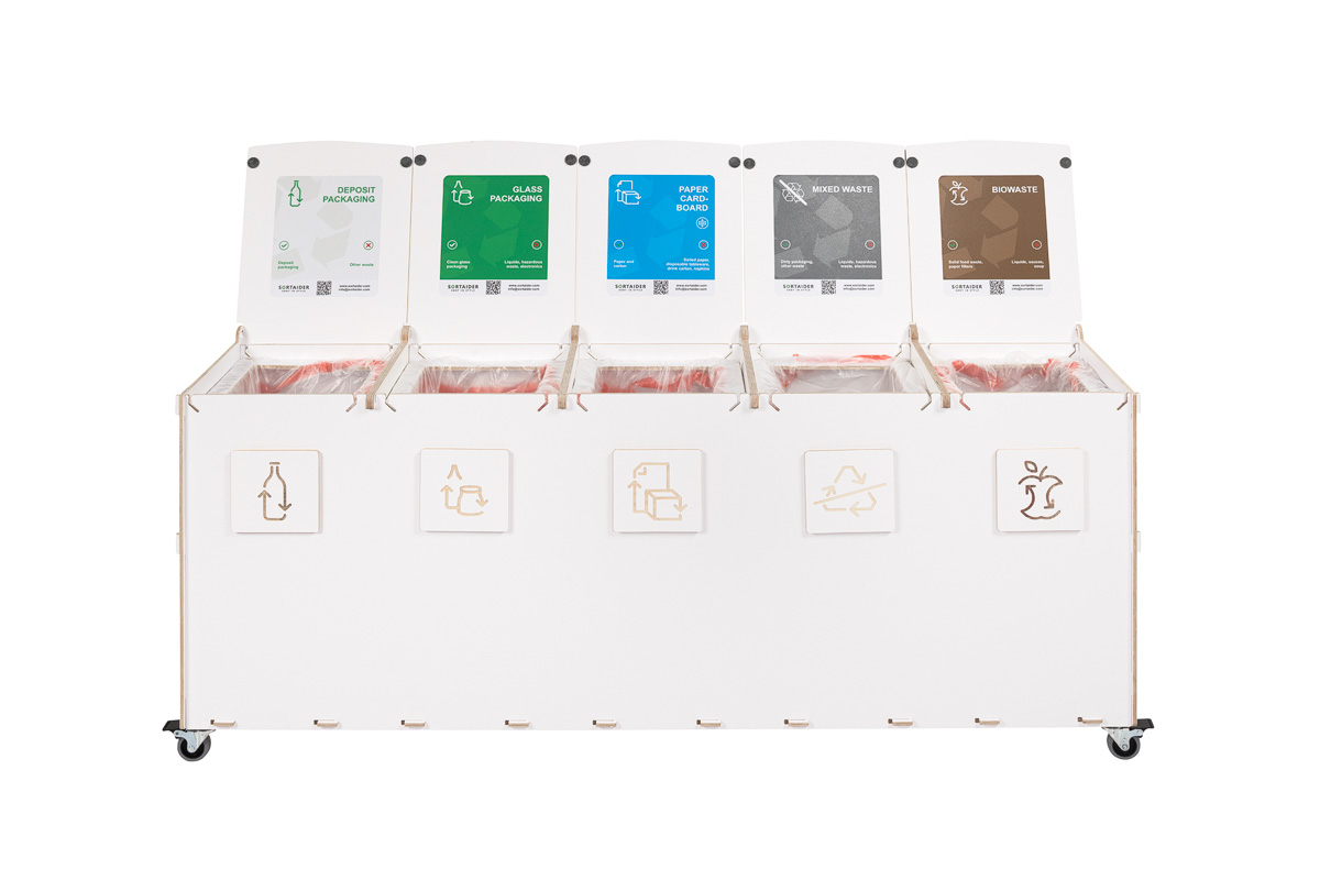 Built for durability and functionality, Sorta features high-quality plywood compartments, lockable swivel wheels, and multilingual, color-coded sorting symbols to support correct disposal. Its robust construction is suitable for high-traffic areas, while the tool-free bag replacement system ensures fast maintenance and hygienic use.
