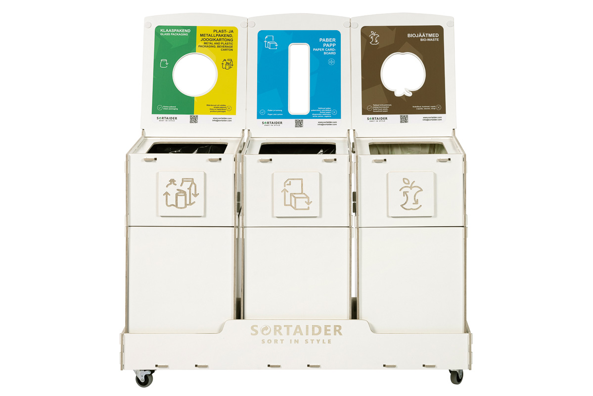 Equipped with lockable wheels, clear sorting symbols, and high-quality plywood bins, it blends practicality with Nordic-inspired design. A 28,3 kg Sortaider product saves approximately 29,1 kg of CO₂, making every bin a meaningful step toward sustainability.